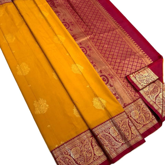 The body and border are typically woven separately and then joined together in a distinctive interlocking technique known as Korvai. This craftsmanship is a hallmark of authentic Kanchipuram sarees. The designs often draw inspiration from temple architecture, nature, and mythology.